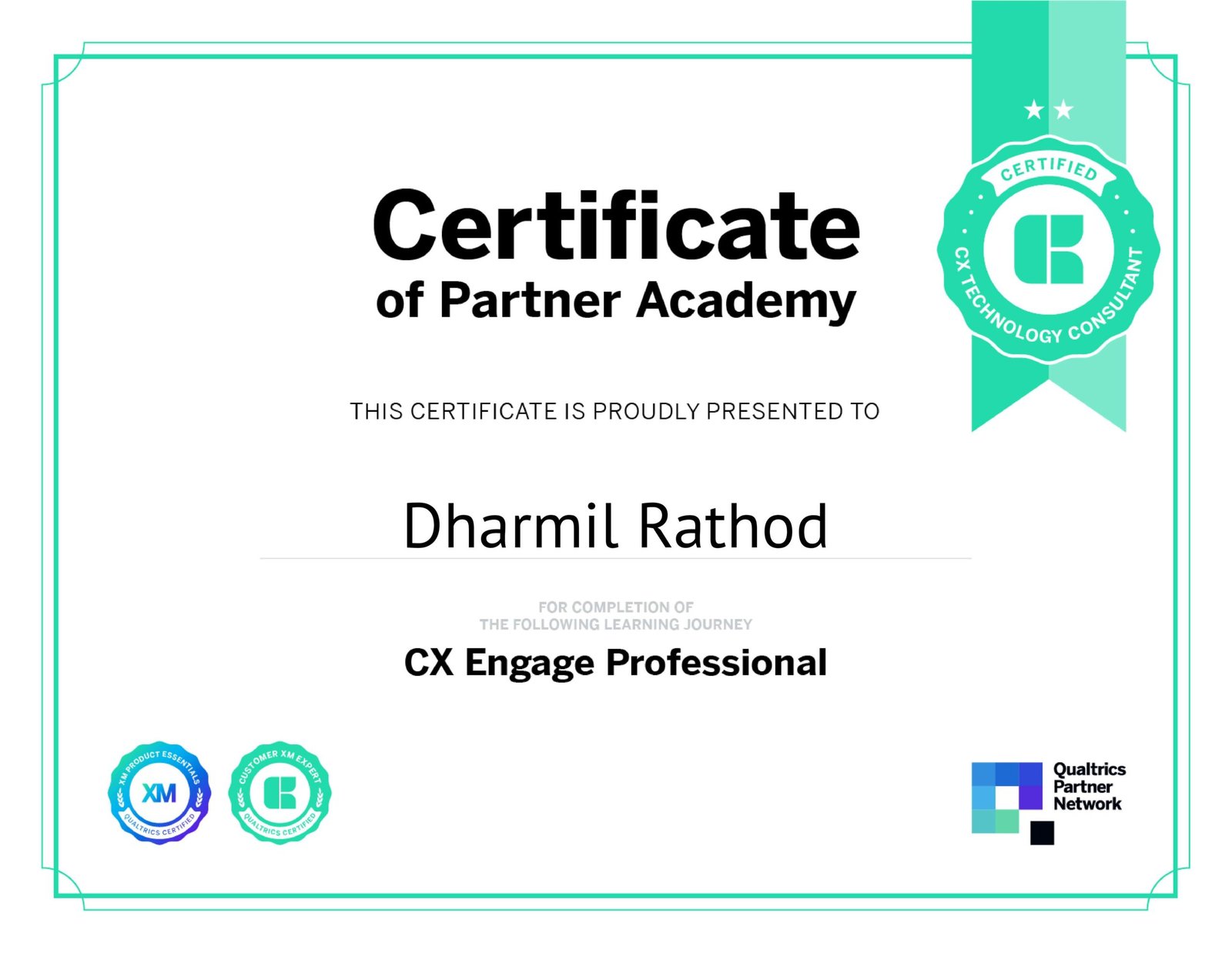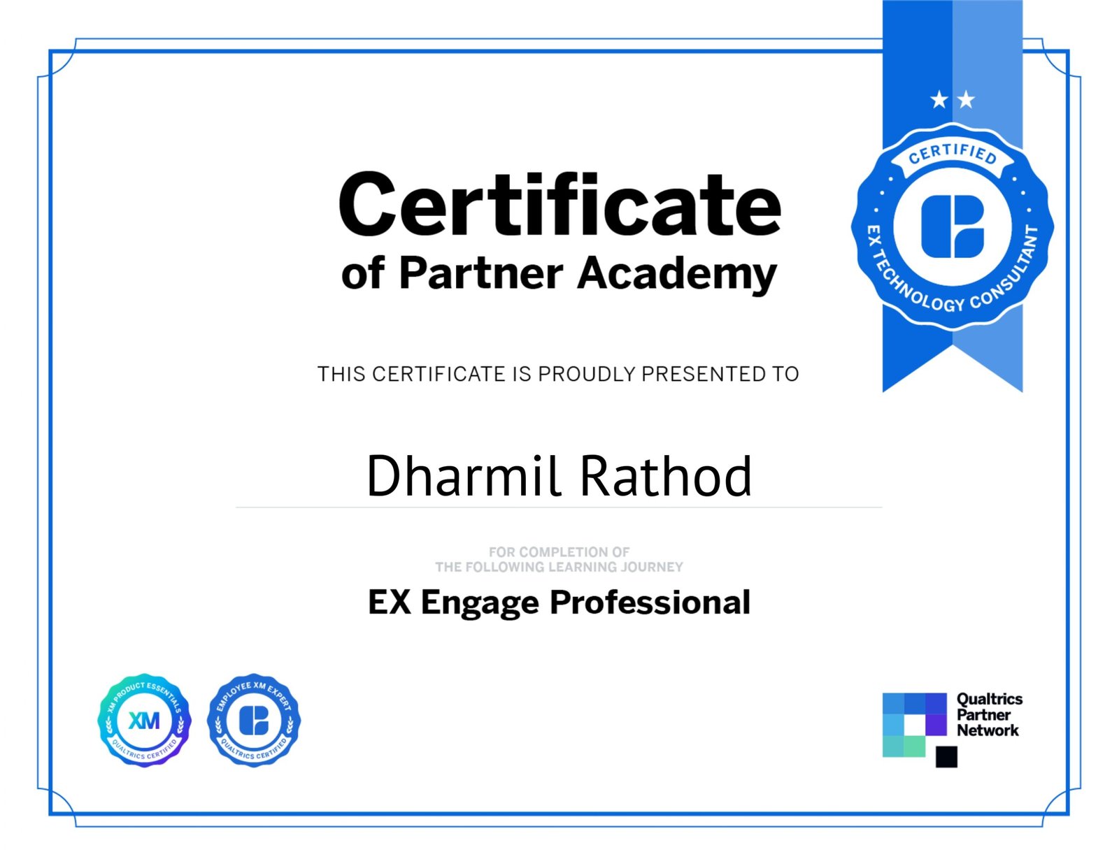 I hold the following professional certifications from Qualtrics, demonstrating my expertise in implementing and managing Customer Experience (CX) and Employee Experience (EX) programs.